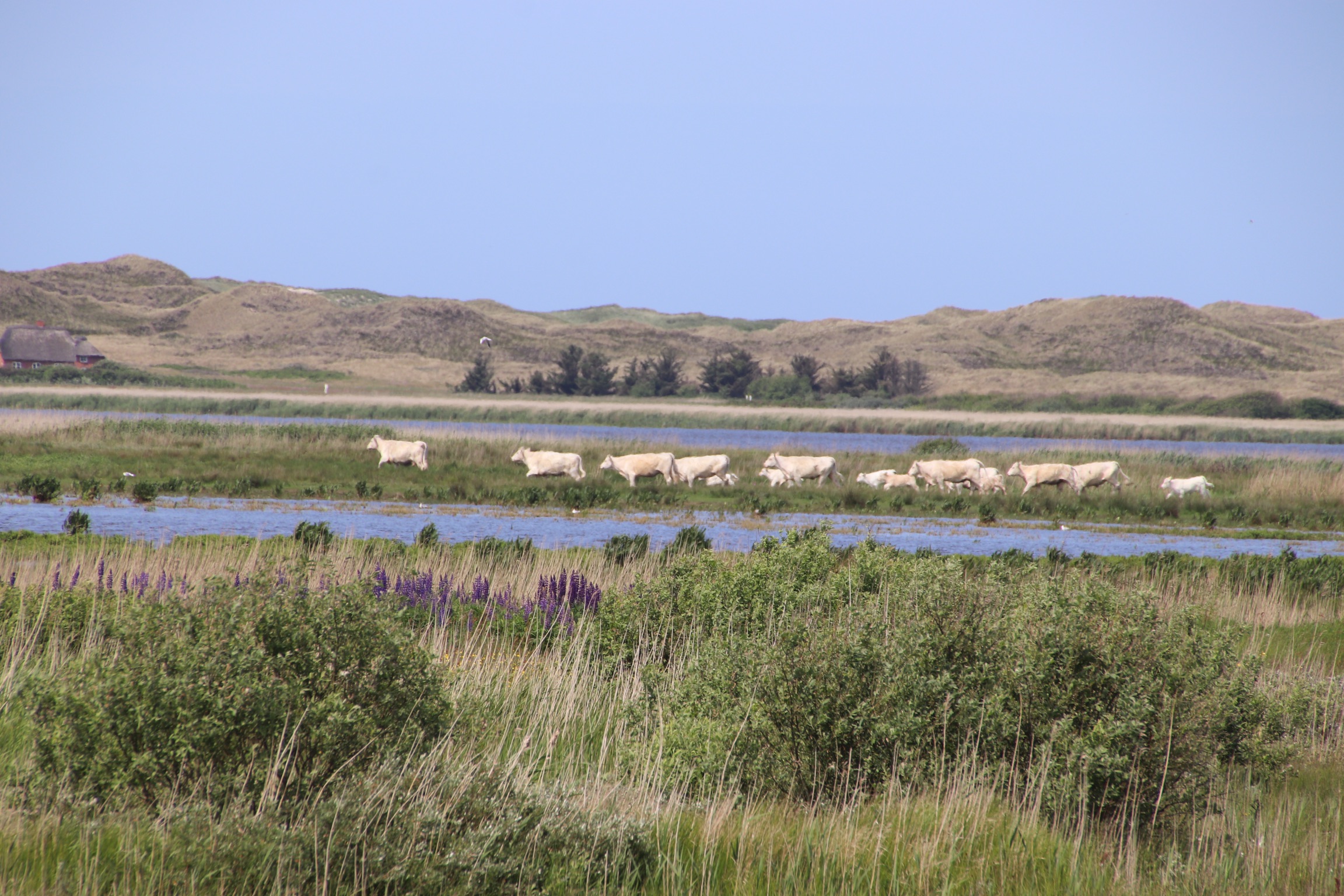 We zijn dan via fraai duinlandschap met veel vakantiewoningen gereden op een smalle strook land tussen Noordzee en een binnenmeer. Alles vlak, behalve de duinen natuurlijk, met witte en bruine koeien.
