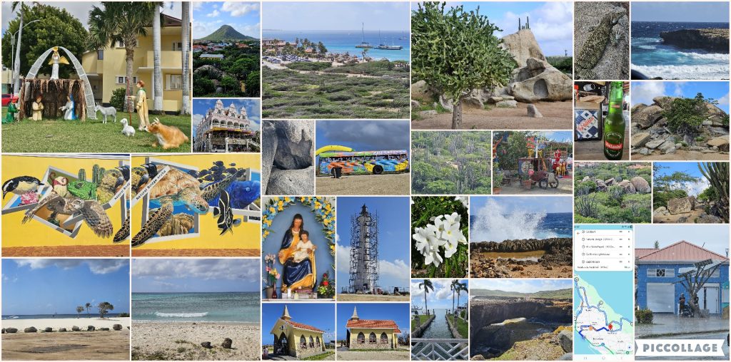 We moeten vroeg op voor onze excursie Discover Aruba. Een leuke tocht over het eiland, alles ligt “om de hoek, 20 minuten” zoals de chauffeur ieder keer zegt. We gaan langs rotsformaties (Casibari), de Natural Bridge (de grootste is ingestort, maar er is er nog één en fraai zicht op woeste zee), het oudste kerkje van het eiland de Alto Vista kapel uit 1750 (herbouwd in 1952), de Californië vuurtoren (genoemd naar een vlakbij vergaand schip, die staat in de stijgers, maar schitterende uitzichten). Onderweg veel, heel veel cactussen. Het is hier duidelijk droger en dus minder groen dan op de andere eilanden waar we zijn geweest. Ook valt op dat de huizen hier beter onderhouden worden. Verder super toeristisch met enorme hotelcomplexen (voor 75% voor Amerikanen). We rijden nog langs Eagle Beach (ieder jaar in de top 10 van de wereld). Terug bij de boot bekijken we Oranjestad nog een beetje, nemen een heerlijk ijskoud lokaal biertje (Balashi).