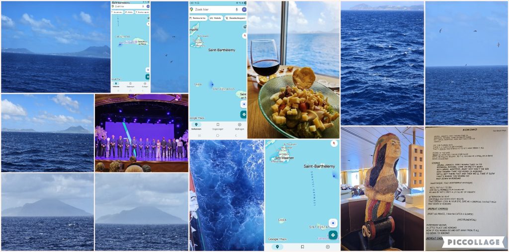 Een drukke dag voor ons. Trudy heeft van alles aangestreept in het dagprogramma. Na ontbijt met een voormalig stuurman op SS Rotterdam en loods staat er salsa gepland. We gaan kijken op het Lido dek, maar haken snel af, te warm. Dan is er de Daily trivia, we scoren 10 uit 15. Gevolgd door Koorzang met het lied Kokomo. Ankie en Kees zijn daar ook. Dan varen we langs St. Eustatius en later ook nog Saba. Naar het derde SSS eiland, St. Maarten, zijn we op weg. Alle ABC staan voor later deze reis op het programma. We zien ook veel Brown boobies (Bruine Gent) langs de boot die regelmatig naar vis duiken en lekker zweven in de lucht.