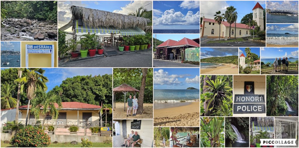 We hebben samen met Ankie (56) en Kees (64)(uit Berg en Dal) een auto met chauffeur geregeld voor 90 euro p.p. We gaan de filmlocaties van Death in Paradise bekijken en een waterval, als dat allemaal past. We rijden over een 3-baans (!!! Vooroordeel?) weg over de brug naar Basse Terre het andere grote eiland waar Deshaise ligt. Het is druk op de weg, maar we rijden lekker door en zijn na 3 kwartier bij de eerste stop. Ondertussen gezellig babbelen met de chauffeur Sunny die wat over het eiland vertelt. We hebben fraaie uitzichten, de filmlocaties met schitterend strand bij de inspectors cabin (die er nu niet staat), Honore police station en Catherins Bar. We hebben dan ook nog tijd om langs de Cascade aux Ecrivisses te rijden voor een stop bij deze waterval. Deze ligt midden in het regenwoud en we horen dan ook de typische regenwoud geluiden van krekels, cicaden, vogels en hier natuurlijk het ruisen van de waterval. We zijn rond 18:30 terug bij de boot.